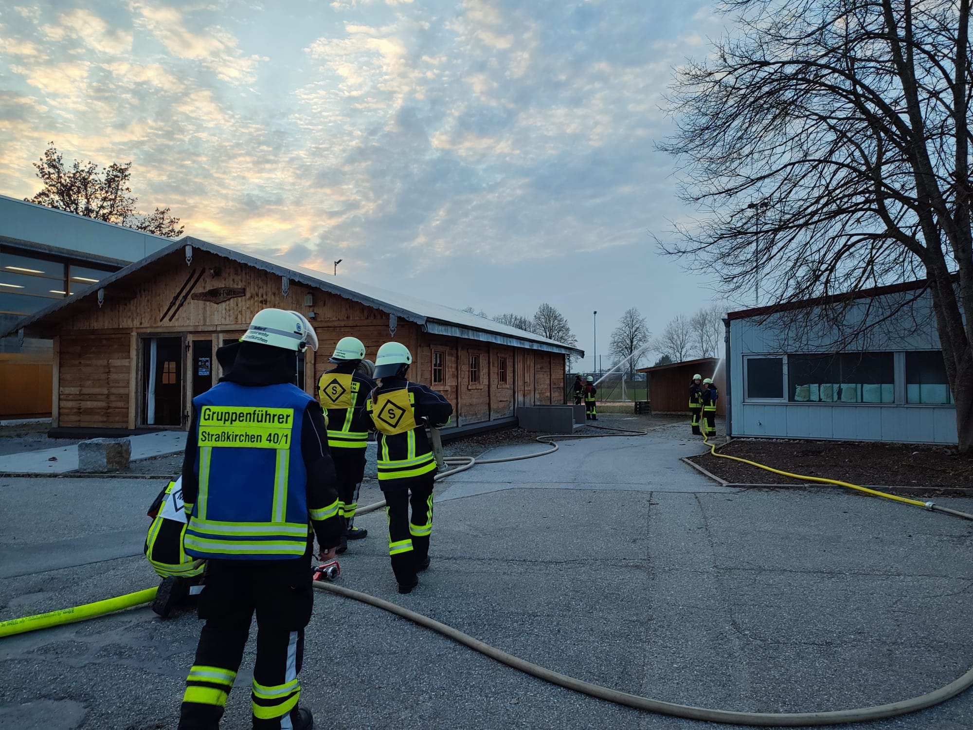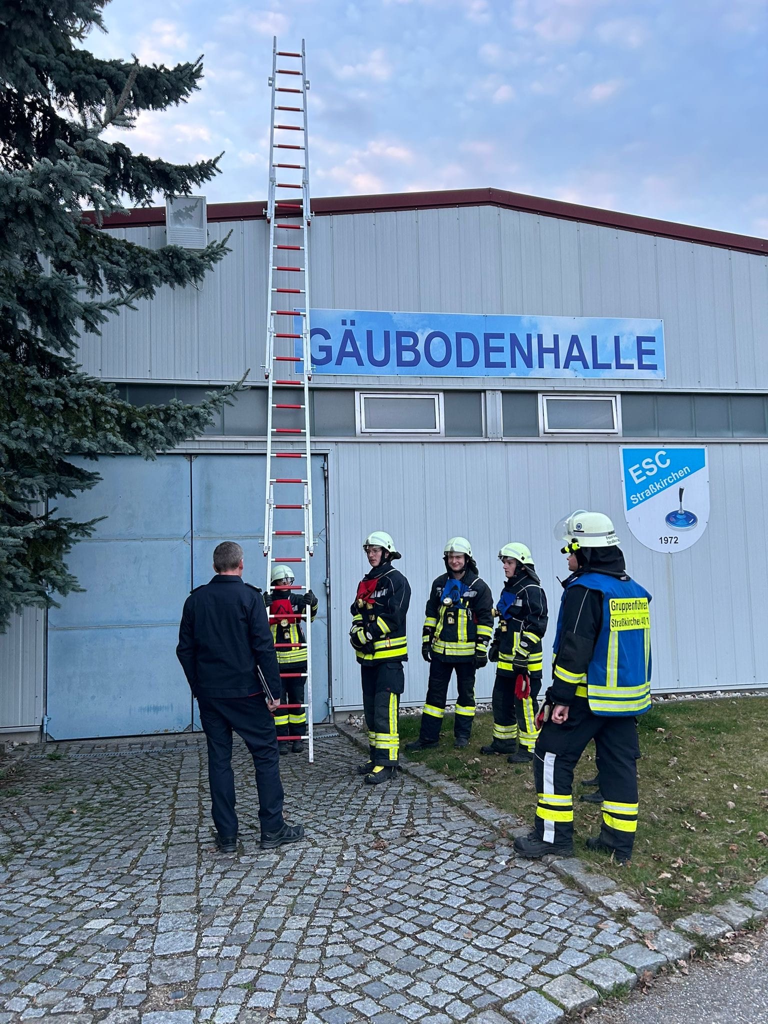 Im ersten Prüfungsteil stand ein angenommener Brand an einem Anbau der Gäubodenhalle in der Paitzkofener Straße im Mittelpunkt. Die Prüflinge führten den Löschangriff gemäß den Vorgaben der Feuerwehr-Dienstvorschrift 3 („Einheiten im Lösch- und Hilfeleistungseinsatz“) durch, einem wesentlichen Bestandteil der Grundausbildung. Dabei setzte der Angriffstrupp den Verteiler und brachte das erste C-Hohlstrahlrohr zur Brandbekämpfung zum Einsatz. Parallel dazu stellte der Wassertrupp die Wasserversorgung sicher, zunächst vom Hilfeleistungslöschgruppenfahrzeug (HLF 20) zum Verteiler und anschließend vom Fahrzeug zum Überflurhydranten. Auch das zweite C-Rohr wurde vom Wassertrupp zur Brandbekämpfung eingesetzt. Im Anschluss nach der Brandbekämpfung brachten der Angriffstrupp und der Wassertrupp gemeinsam die vierteilige Steckleiter in Stellung. Der Schlauchtrupp übernahm zunächst die Absicherung gegen den fließenden Verkehr und unterstützte später mit dem dritten Strahlrohr. Diese Abläufe wurden zweimal durchlaufen, was eine besondere Herausforderung darstellte, die die Prüflinge jedoch souverän meisterten.